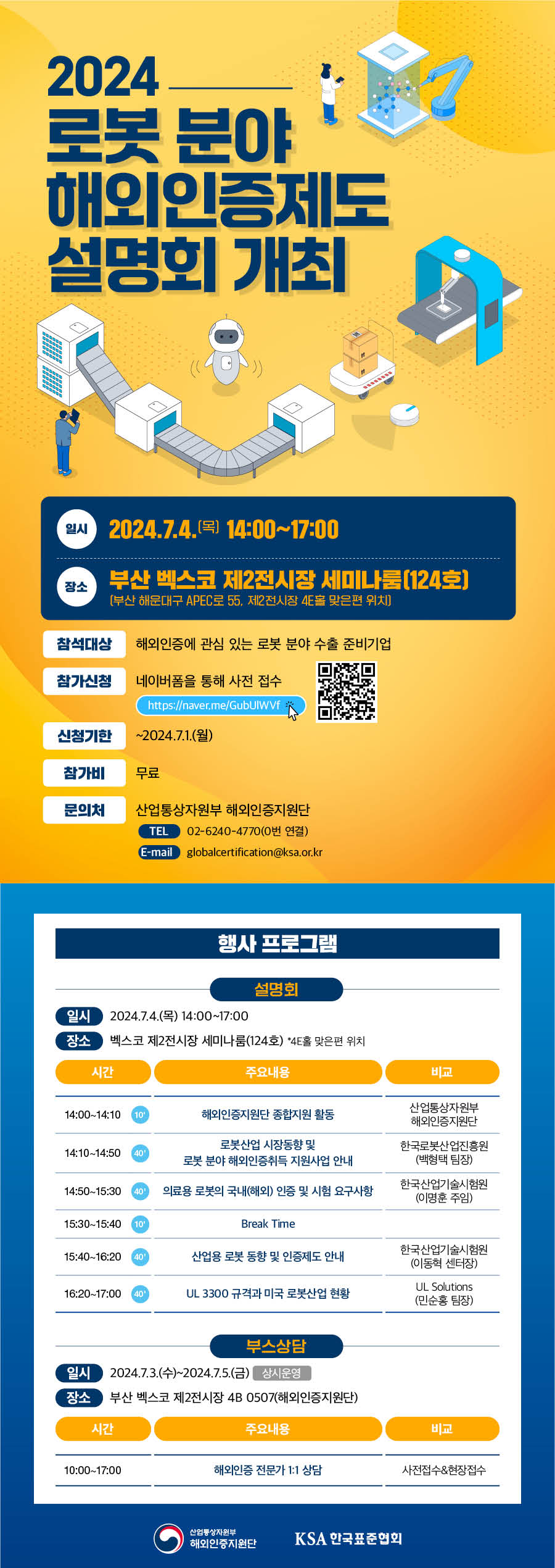 [산업통상자원부 해외인증지원단] 2024 로봇분야 해외인증제도 설명회 개최 안내(7/4(목) 14시, 부산 벡스코)