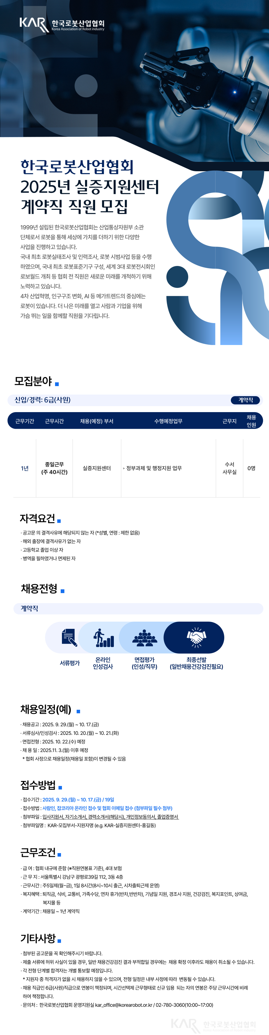 [한국로봇산업협회] 한국로봇산업협회 실증지원센터 계약직 직원 채용 공고(~10/17, 금)