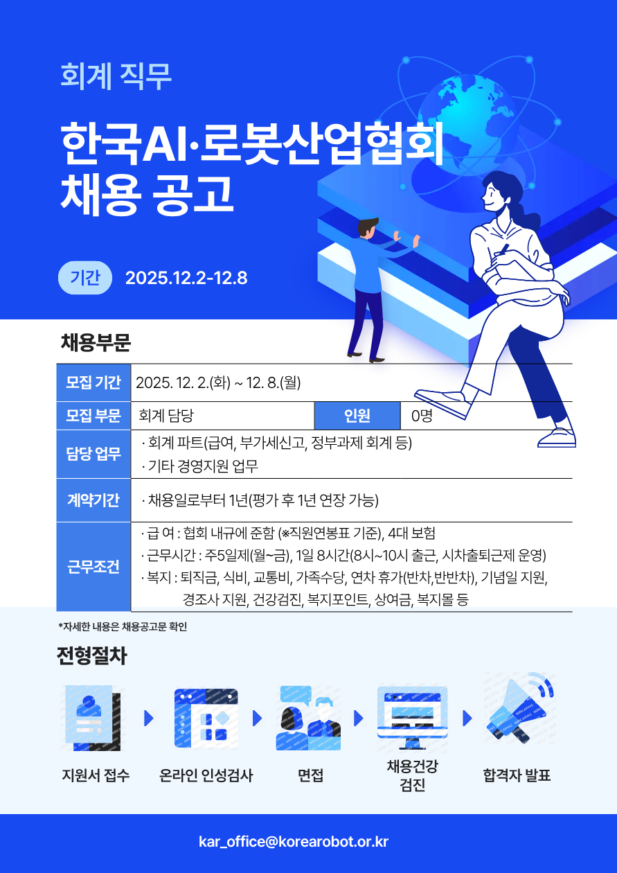 [한국AI·로봇산업협회] 운영지원실 계약직 직원(회계 직무) 채용 공고(~12/8, 월)