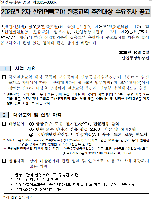 2025년 2차 산업협력분야 절충교역 추천대상 수요조사 공고(~10.24 까지)