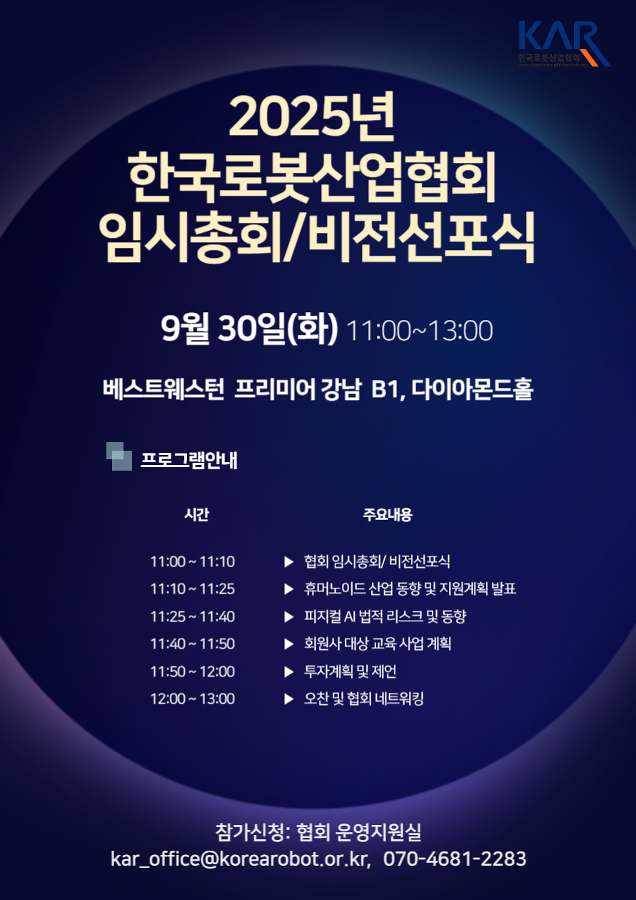 한국로봇산업협회 2025년도 임시총회를 다음과 같이 개최하오니, 회원사 여러분들의 많은 관심과 참가 부탁 드립니다.