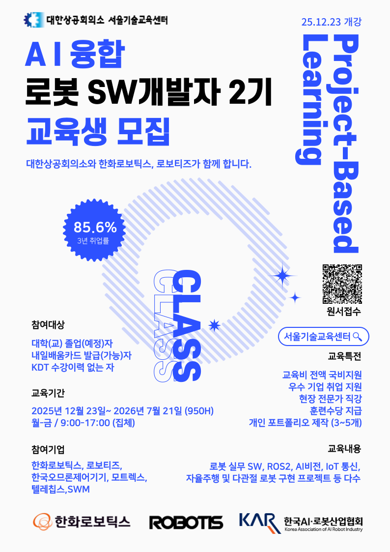 로봇 실무 SW, ROS2, AI비전, IoT 통신, 자율주행 및 다관절 로봇 구현 프로젝트 등 해당 교육에 관심이 있으시다면 아래의 포스터를 클릭해 주세요.